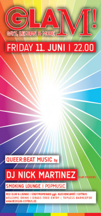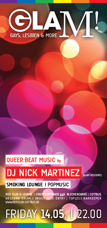 Zum zweiten Mal in diesem Jahr lud der Red Club (ggü. des Blechen Carré) zur "Glam! - Gays, Lesbian & More" ein. Resident DJ Nick Martinez heizte mit que(e)r gemixten House- & Electrobeats, Charts aber auch mit Black Music ordentlich ein. Feinste Tanzmusik - einfach nur perfekt und exzellent gemischt. Weitere Schmankerl waren auch die sexy Topless Barkeeper - da zog es so einige Leute klopfenden Herzens an die Bar. Die loungige Atmosphäre und der elegante Stil des RED Club sind meiner Meinung nach ideal für entspannte aber auch ausgelassene Szenepartys in Cottbus. So lassen sich Partys feiern. Ich hoffe nur, dass beim nächsten Mal auch ein paar mehr Mädelz in den Red Club finden und sich mit unter das gemischte Partyvolk mischen. Es lohnt sich wirklich... Persönlich war ich mehr als begeistert und freue mich bereits schon jetzt auf die nächsten Partys. Der Sommer wird heiss, soviel steht fest.